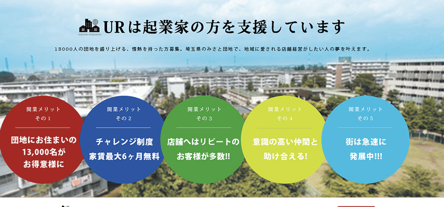 URの起業家応援プロジェクトとして、 埼玉県のみさと団地を盛り上げるためのサイトを制作。 地域活性と起業家応援のコラボを実現させた、 話題性の高いサイト。